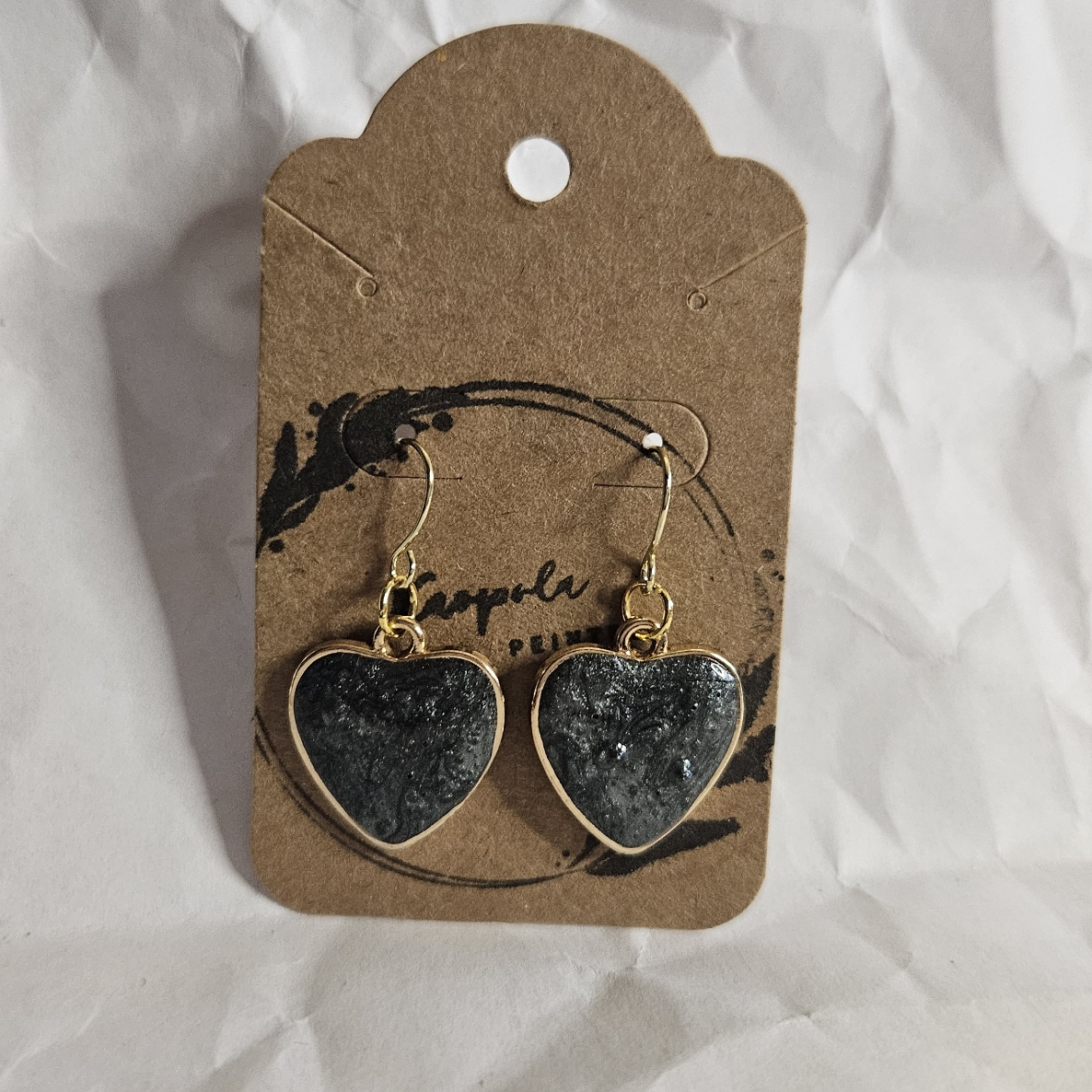 Apportez une touche d’audace avec ces boucles d’oreilles « Mon cœur voilé ». Façonnées à la main en époxy noir feutré, leurs cœurs sombres capturent un charme mystérieux, suspendus délicatement à des crochets en or 14 carats. Un bijou unique pour révéler votre style avec un clin d’œil espiègle.